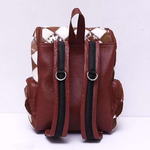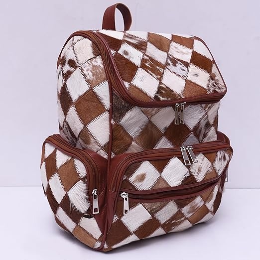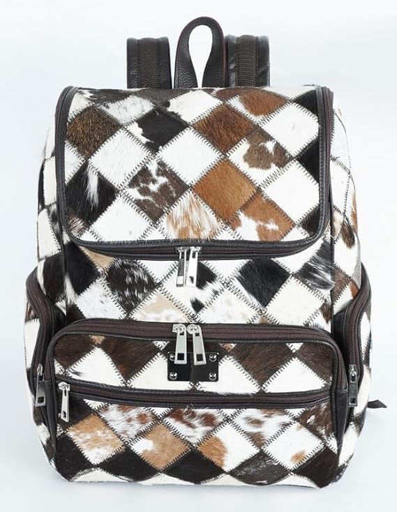 handmade backpacks crafted from genuine cowhide patchwork are showcased in this image. Featuring a striking diamond pattern in varying shades of brown, black, and white leather, these versatile backpacks are perfect as diaper bags, travel companions, or stylish everyday accessories. With dual-zipper front pockets and a secure top flap closure, these unisex backpacks make a thoughtful and practical gift for a baby shower or any occasion.