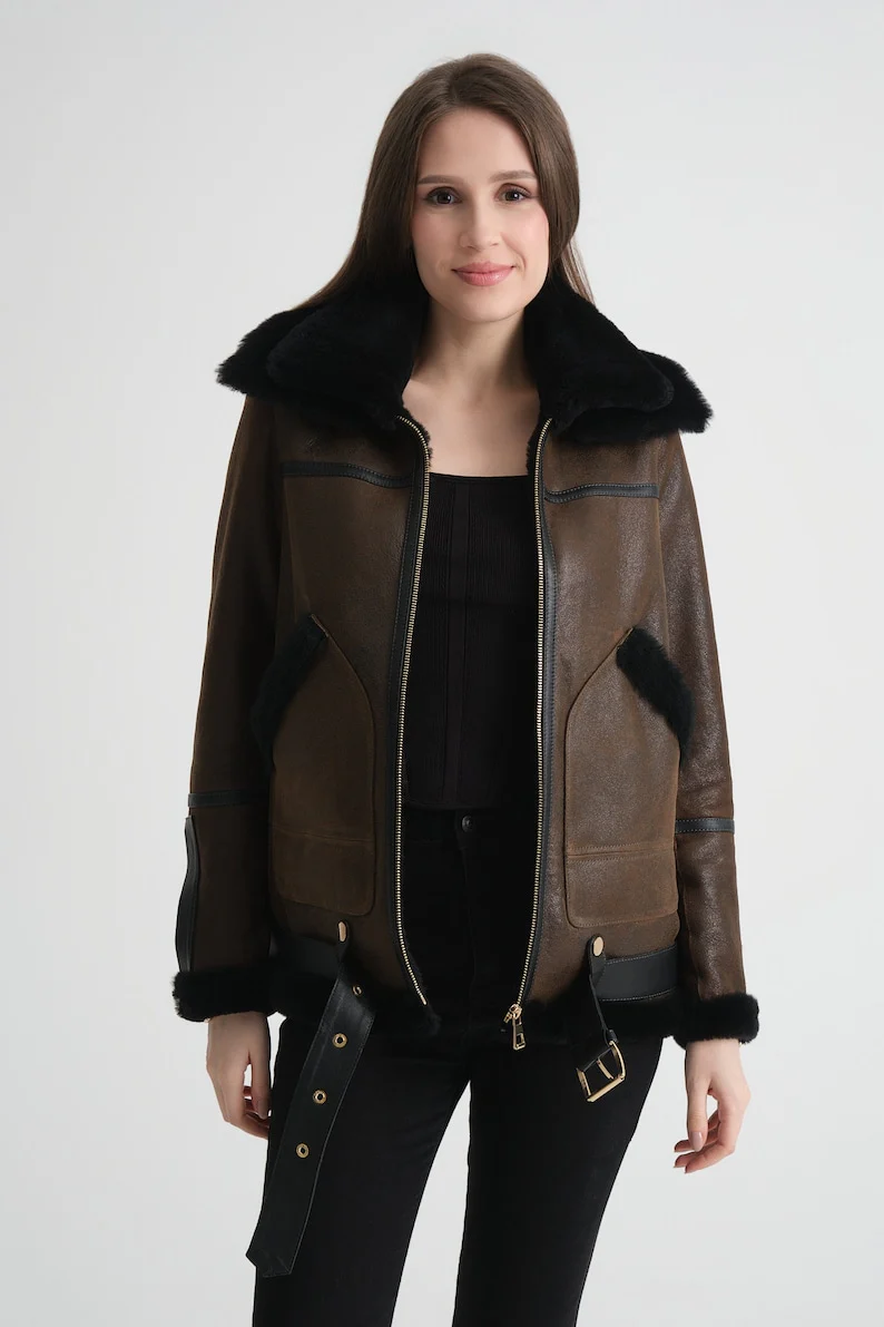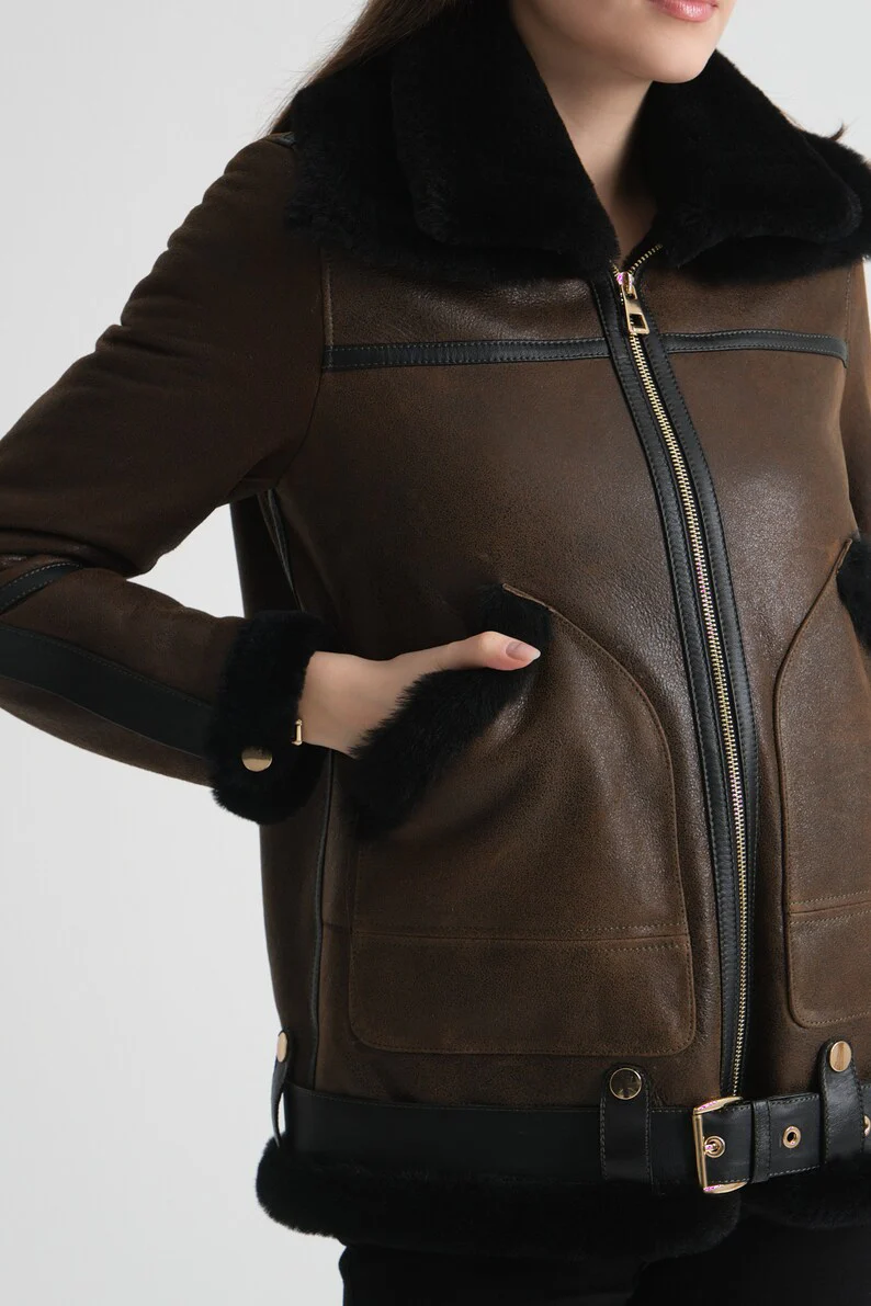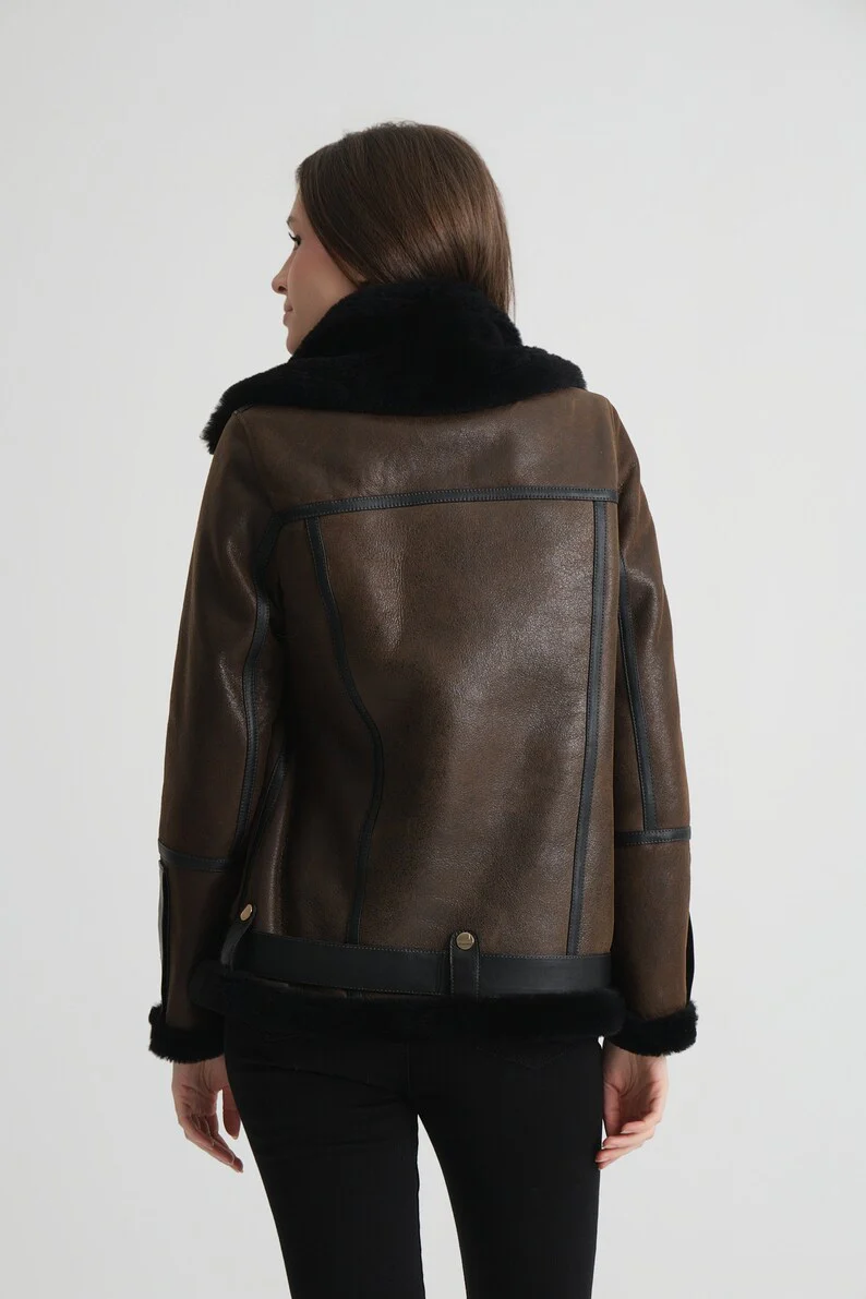 Crafted from premium genuine leather, this shearling pilot jacket womens features a rich dark brown hue and a cozy shearling lining for exceptional warmth. Designed with classic aviator style, it offers both durability and timeless appeal, making it an expert choice for those seeking authentic, stylish outerwear that performs in colder conditions.