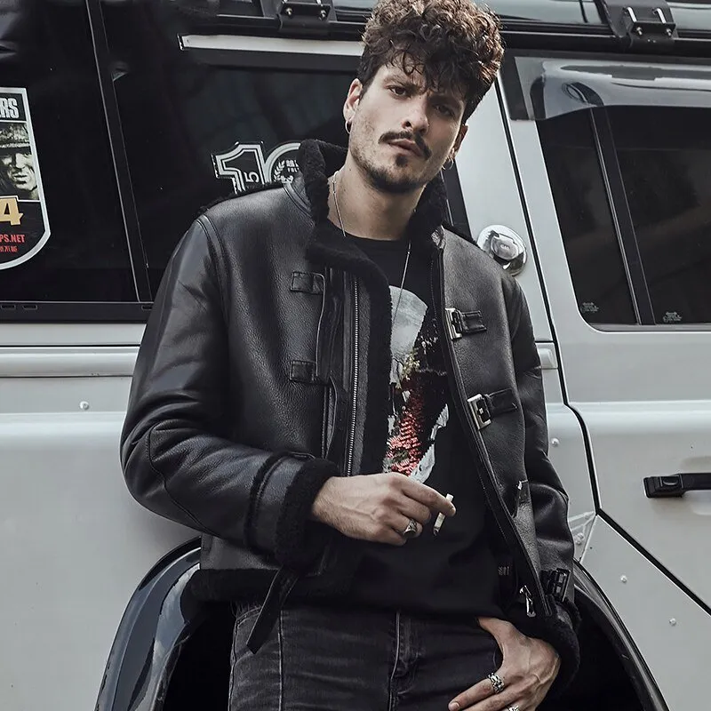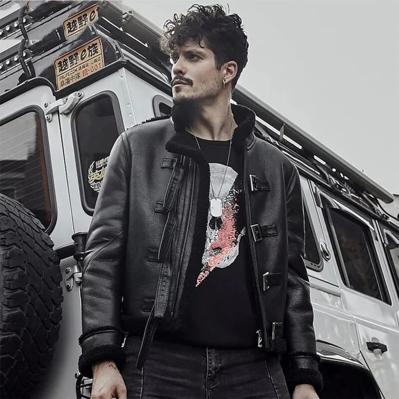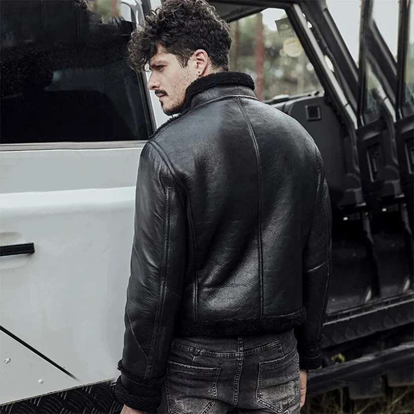 Mens Black Flying Aviator Sheepskin Shearling B3 Bomber Jacket
