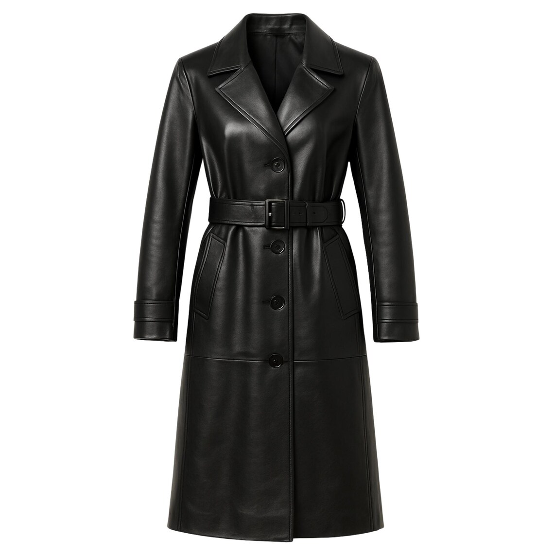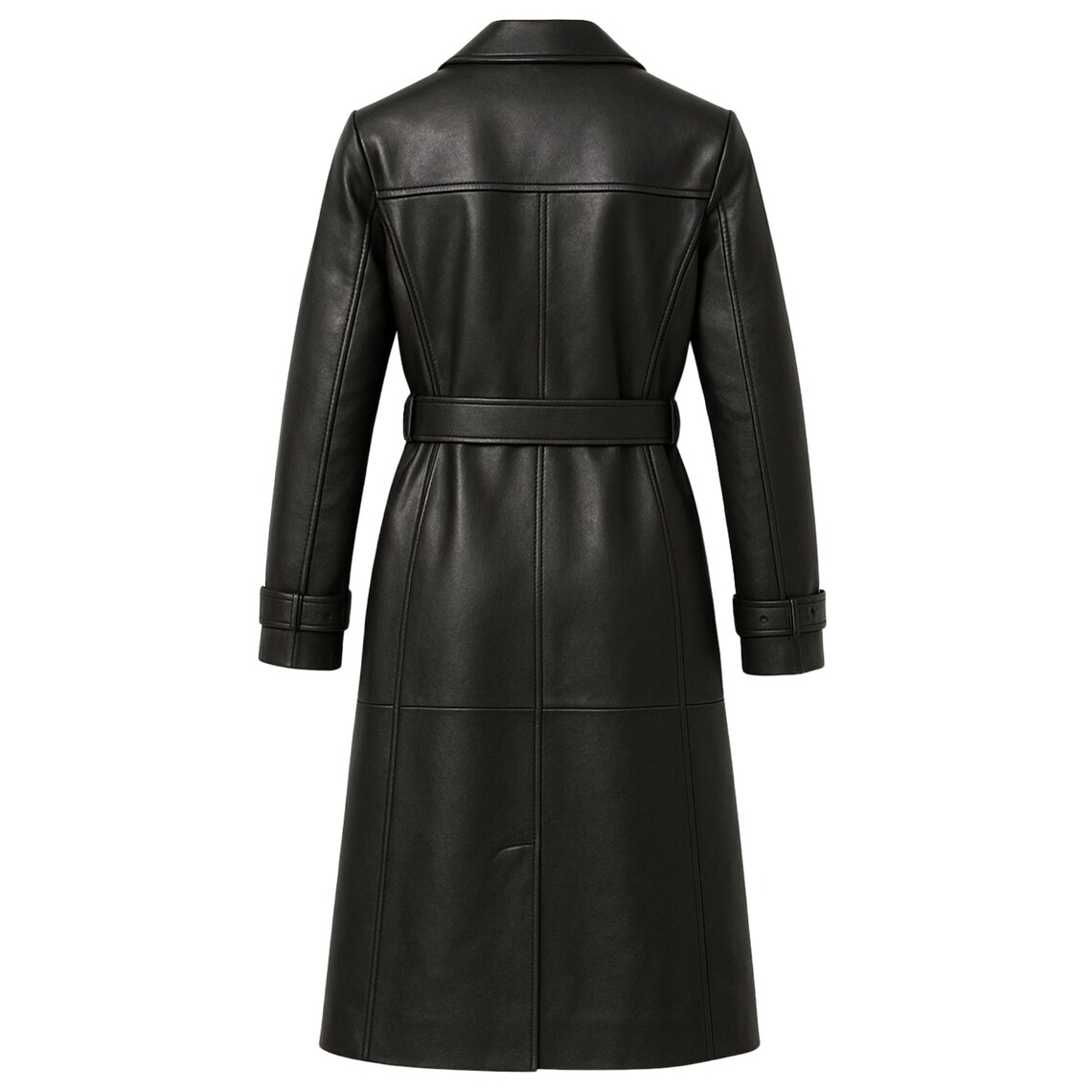 Women’s Black Genuine Leather Trench Coat – Long Double-Breasted Overcoat with Belt & Stylish Lapels